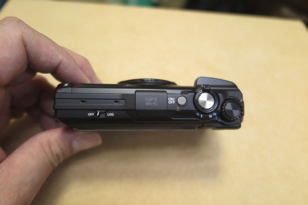 カメラ上部には電源スイッチとシャッタースイッチ。シャッタースイッチの周りにズームのレバーがある。右端には謎のくるくるノブあり。回してみるとカチカチ感はなくヌルヌルと回る。何かの設定切り替えなどだろう。真ん中はGPSアンテナが埋まってそうだ。左側には「log」のスイッチがあり、GPSログを取るときはここをオンにするらしい。