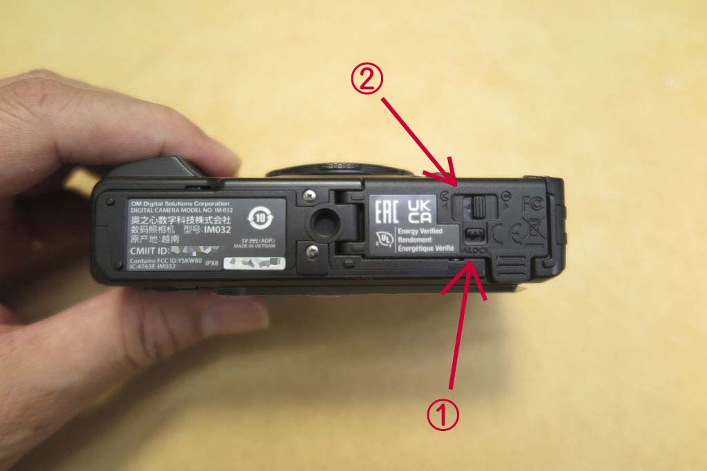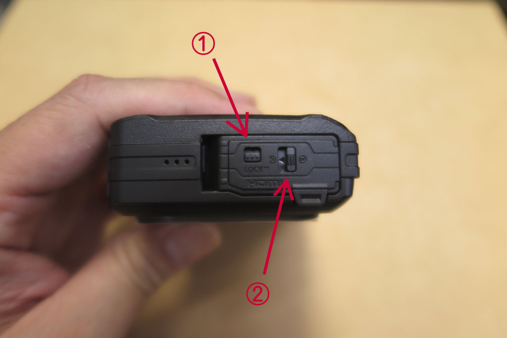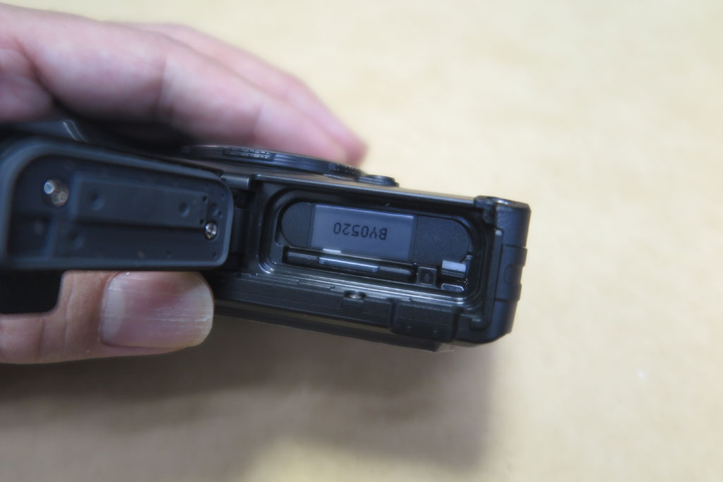 ①②の順につまみを開けると、このふたが開くようになる。水中に浸けても大丈夫な防水なので、しっかり蓋が閉まって水が入らないようになっているのだろう。