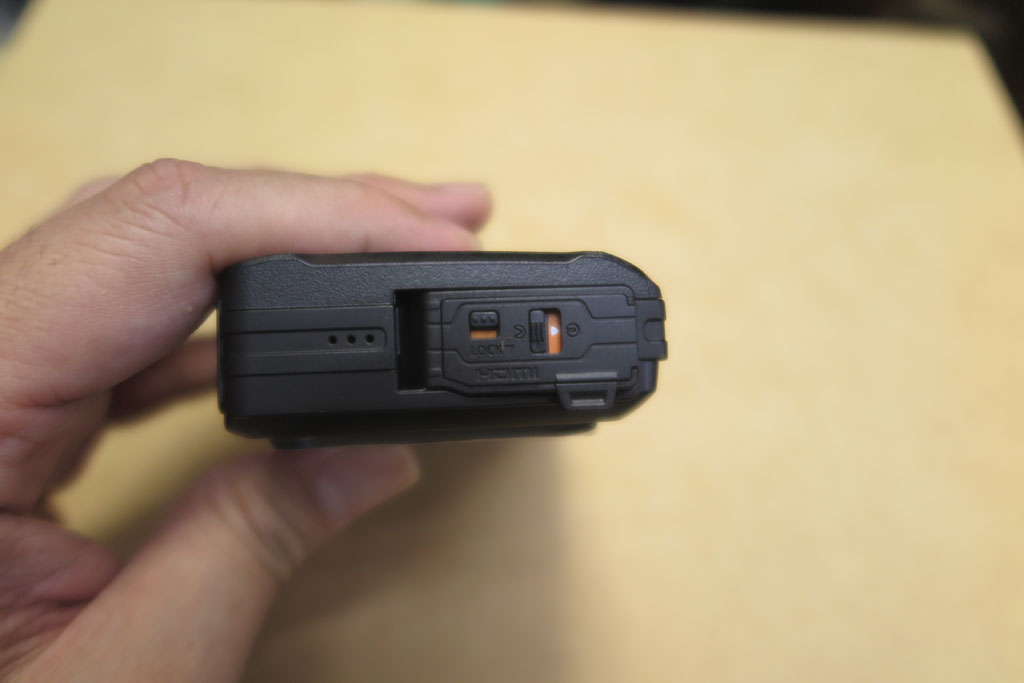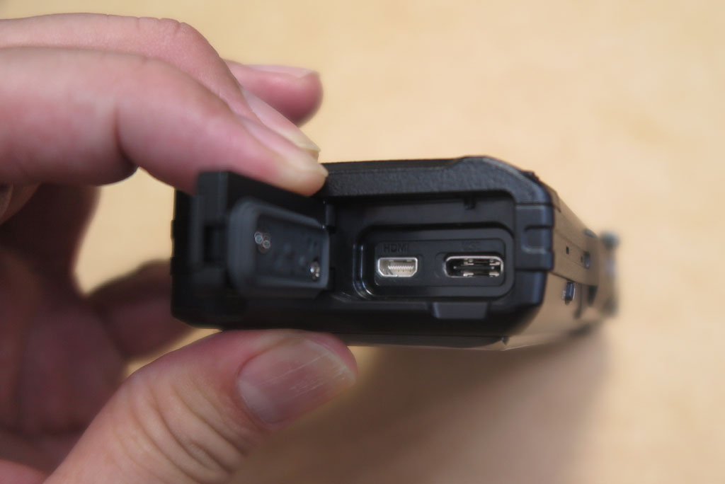 ふたを開けると、USBコネクタとHDMIコネクタがある。電池の充電などはここを開けてType-Cコネクタをつなぐ必要があるようだ。頑丈な分面倒。iPhoneみたいにコネクタ丸出しで防水対応だといいのに。