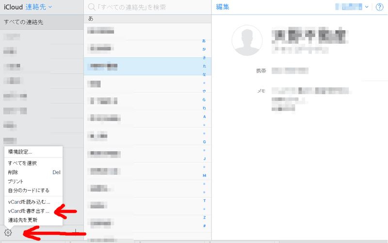 ここで、「連絡先」を見てみると、iPhoneの表示と似た感じで連絡先の一覧が参照できた。 ここで左下にある歯車をクリックしてみると、メニューが出るので、その中からvCardで書き出しを行うのだが、 最初に連絡先をすべて選択してから行う必要がある。現在選択中のものが出力されるようで、全部移行の場合はすべてを選択する。 メニューの中の「すべて選択」を選んでからでもいいし、Ctrl+Aでも全選択してくれる。