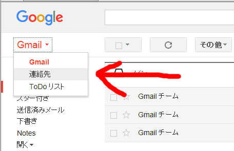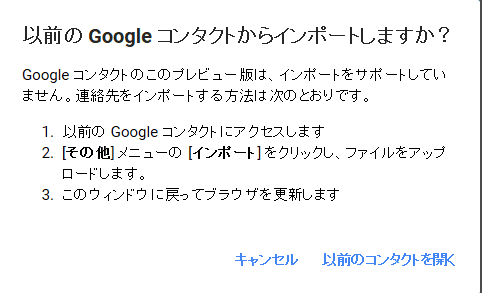 無事vCard形式のファイル書き出しに成功したら今度はこれをgoogleに食わせる。PCからgoogleにログインしてgmailを開く。左上の赤字Gmailをクリックすると連絡先のメニューが出るので、それをクリック。 すると連絡先設定画面に移動。ここで、左のメニューの「もっと見る」をクリックして増えたメニュー項目のなかの 「インポート」をクリックする。すると、このバージョンではサポートしていないと出てきたので、 前のバージョンで作業を進めるため、以前のコンタクトを開くをクリックする。