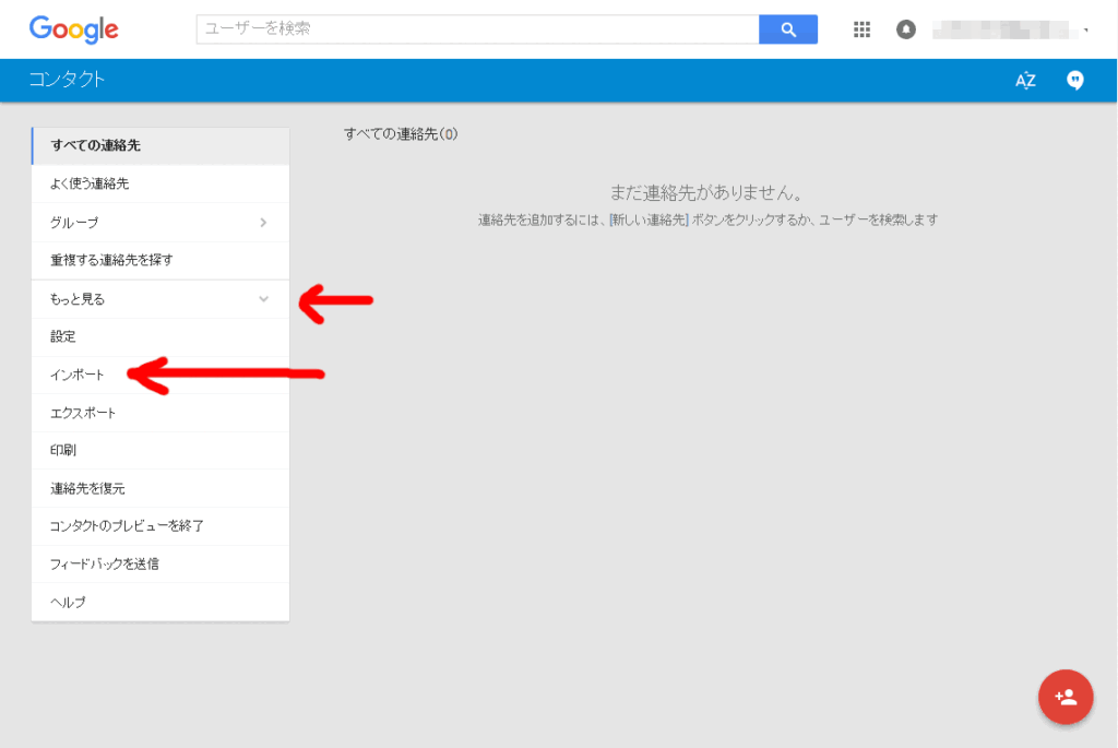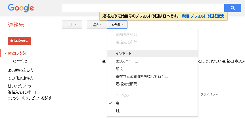 古いバージョンと思われる画面に変わり、ここから「その他」をクリックして出てきたメニューから「インポート」を選ぶ。 するとファイルのアップロード画面になるので、ここで上で出力したvCardファイルを読み込ませる。