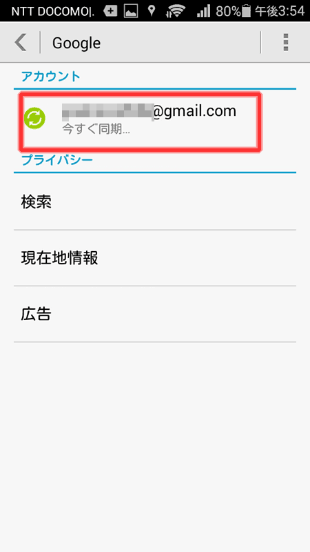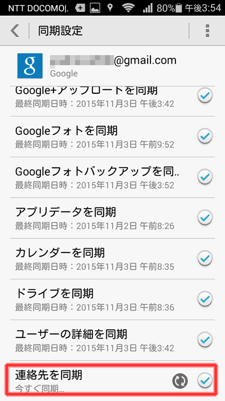 設定画面からアカウントのgoogleを選択。アカウント名が表示されたらそこをクリックすると、同期する一覧が表示される。 一番下に連絡先があったので、クリックして一度同期を外し、もう一度クリックすると強制同期。 少し長い時間くるくるが回っていたので連絡先を取り込んでいる様子。同期が終わるまでしばらく待機する。