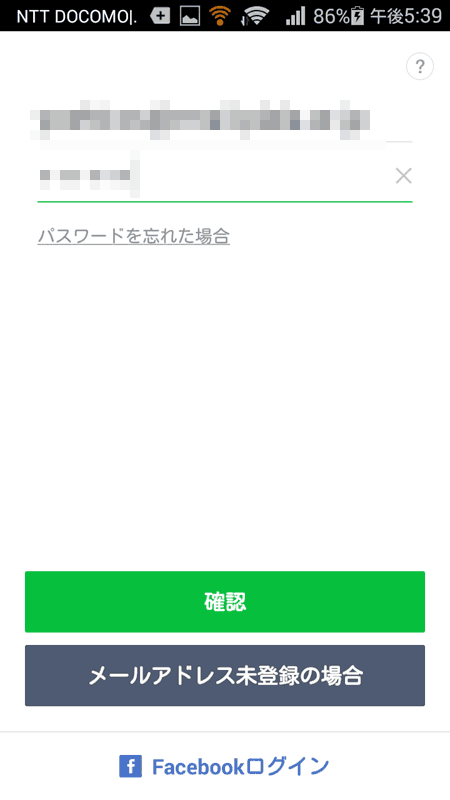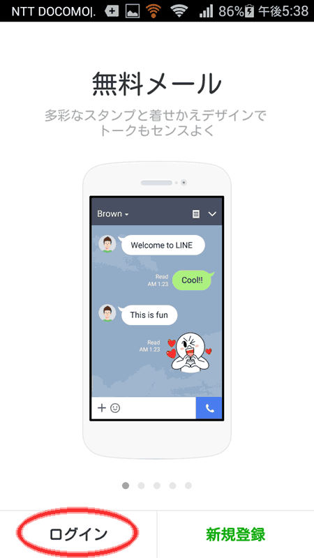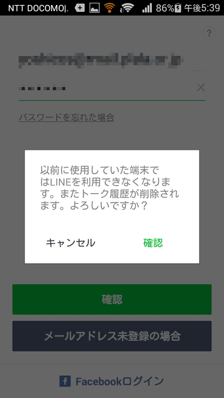 インストールが終わったら実行してみると、初期画面が出てきた。新規登録ではなく既存のアカウントを引っ越すので、 ログインで入る。するとメールアドレスを要求される。LINEアカウントで登録していたメールアドレスを入力すると、 既存端末のほう(iPhone)は使えなくなるのと、履歴などすべて消えるとのこと。完全に引越しが行われるようだ。 どうしようもないので、そのまま承諾する。