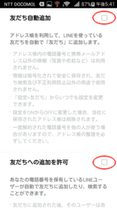 その次は友だち自動追加確認。あまり広まりたくないのと勝手に登録されると嫌なので、 チェックはすべて外す。