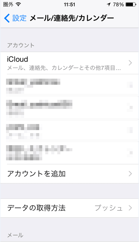 このページの「連絡先を移行する」をみて、連絡先を引っ越す。まずは現在のiPhoneの状態。 「設定」から「メール/連絡先/カレンダー」へ移動すると、アカウントの先頭にはicloudが表示されている。 デフォルトアカウントはicloudのようなので、それをクリックすると、icloudへの同期設定が出てくる。 ここで連絡先の同期を確認するがすでに同期となっているので、どうやらicloudには連絡先はアップされているようだ。