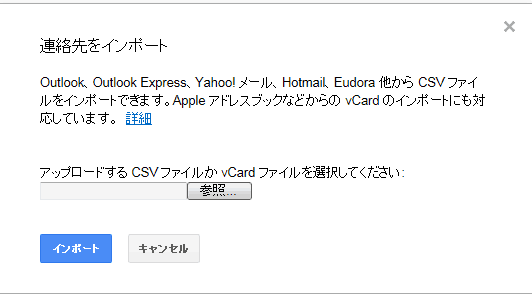 無事vCard形式のファイル書き出しに成功したら今度はこれをgoogleに食わせる。PCからgoogleにログインしてgmailを開く。左上の赤字Gmailをクリックすると連絡先のメニューが出るので、それをクリック。 すると連絡先設定画面に移動。ここで、左のメニューの「もっと見る」をクリックして増えたメニュー項目のなかの 「インポート」をクリックする。すると、このバージョンではサポートしていないと出てきたので、 前のバージョンで作業を進めるため、以前のコンタクトを開くをクリックする。