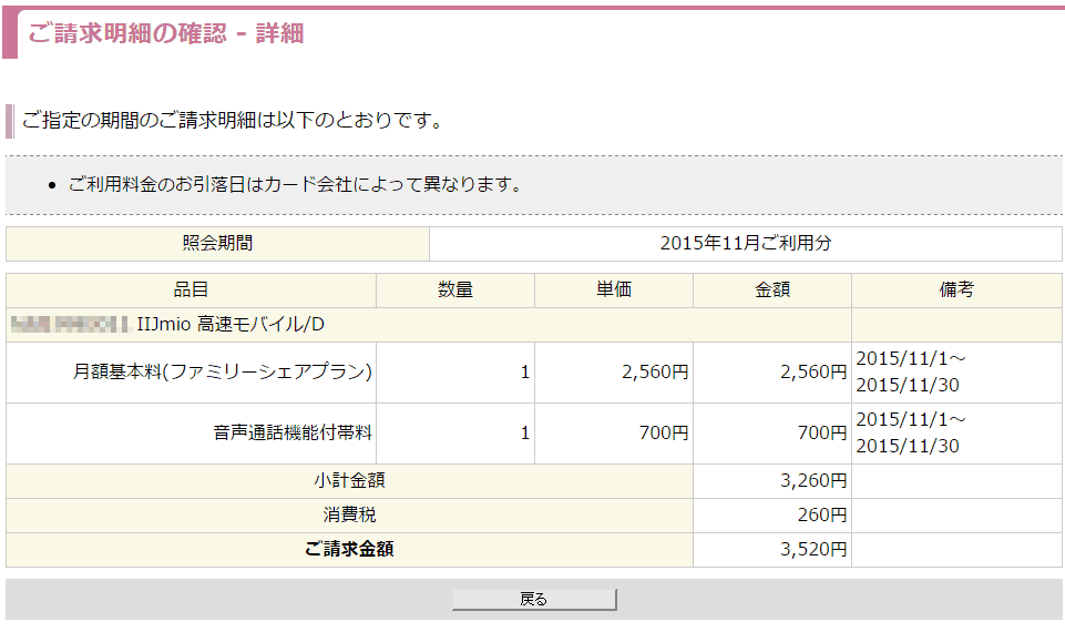 そして、IIJmio側の請求明細。翌月の20日くらいにならないと見れないので、出てくるのが遅いのだが、 内容はとてもシンプル。基本料と音声通話付帯費のみ。現在ファミリーシェアプランで2回線使っているが、 その辺りは関係なく基本料に含まれている様子。ということはもう1回線増やしても、この料金のままのはず。