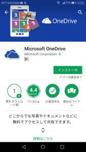 次にmicrosoftのOneDriveを入れる。無料で5GBが使えるはず。アプリがなくてもwebでofficeが使えてPCだと少し便利。 でもスマホでExcel見るのは狭すぎて厳しい。そしてCPU負荷も大きい。ただデータ用のクラウドディスクとしても使えるので、 一応入れておく。ドキュメントファイル置き場がメインの使用方法。
