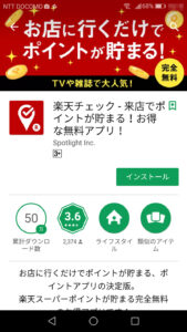 楽天チェックを入れておく。決まった場所に行けばポイントが貯まるらしいが、なかなかその場所がなく、 また、行く用事があったときもアプリを起動していなくて、何もなかったりと難しい。 ポケモンgoくらいきちんとこれ目的で移動しないと難しいが、大したポイントはつかないのがやる気の出ないところ。