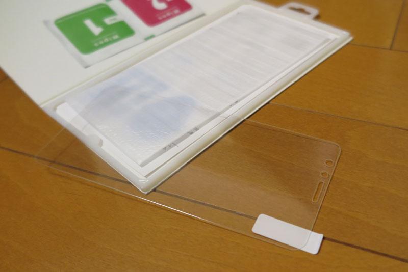 端末購入時はいろいろと問題があり、楽天モバイル店舗で売っていた保護フィルムは購入せず、 別途BICカメラで購入。しかし機種が珍しいこともあり、専用品は見つからず、液晶画面向けの汎用品を購入。 どうやら、保護フィルムではなく保護ガラスとのこと。わりと厚みがある。