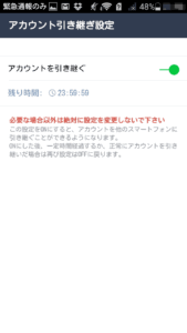 引き継ぎ設定を行うと、カウントダウンが開始される。制限を切られてしまうとちょっとアセるが、 実際には24時間もあり、十分な時間が与えられている。これからすぐに作業するなら特に問題はないのだ。 あと、チェックを元に戻すと、まだ引き返せるのかな?。LINEで危ない橋は渡れないので、 試してみる事はせずに、このまま作業を進めていく。