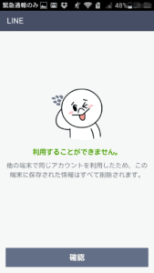 ちなみに、旧端末側を見てみると、LINEは使用不可能に。多分引き継ぎの確認ボタンを押したときにこの画面になったはず。 LINEはかなりアカウント管理に厳しいようで、同じアカウントで複数の機器での使用は難しい。 まあその分安全とも言えるんだけどね。