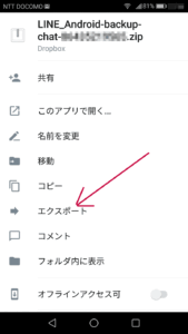 どうやら、line_backupフォルダが有りそこにバックアップファイルがあると、インポートメニューが出てくるようなのだが、 今は何もしていないので、バックアップファイルが存在せず、インポートのメニューが出てこないようだ。 なら、ファイルをそのバックアップフォルダに置けばいいのだ。 トーク履歴のバックアップファイルは、dropboxにあるので、一旦LINEは放置して、dropboxを起動しトーク履歴のバックアップファイルを選択。 そのファイルの右側にある三角を押す。