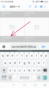 これで端末内のどこに保存するかのファイルエクスプローラのような画面となるので、LINE_Backupフォルダを探す。