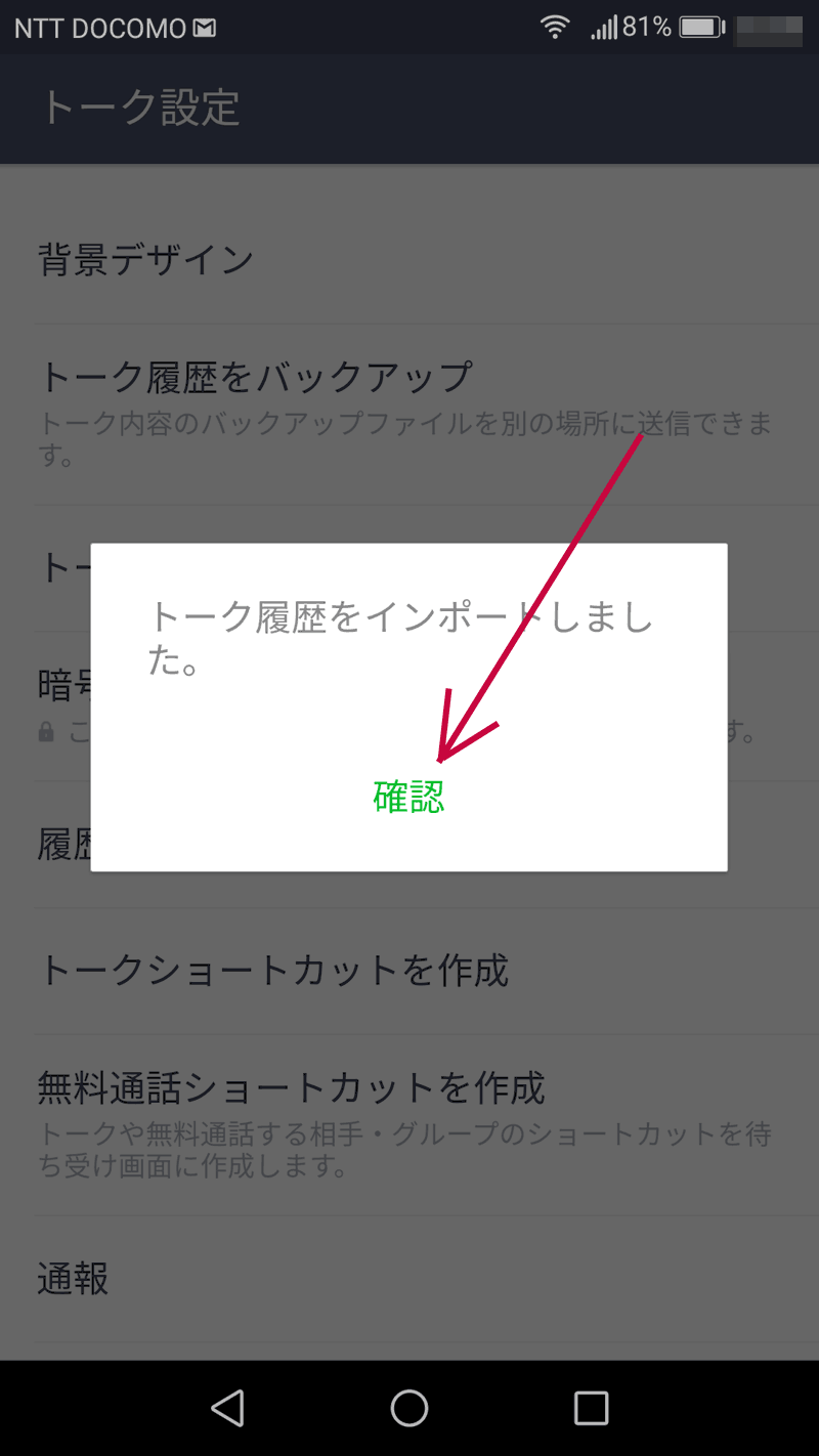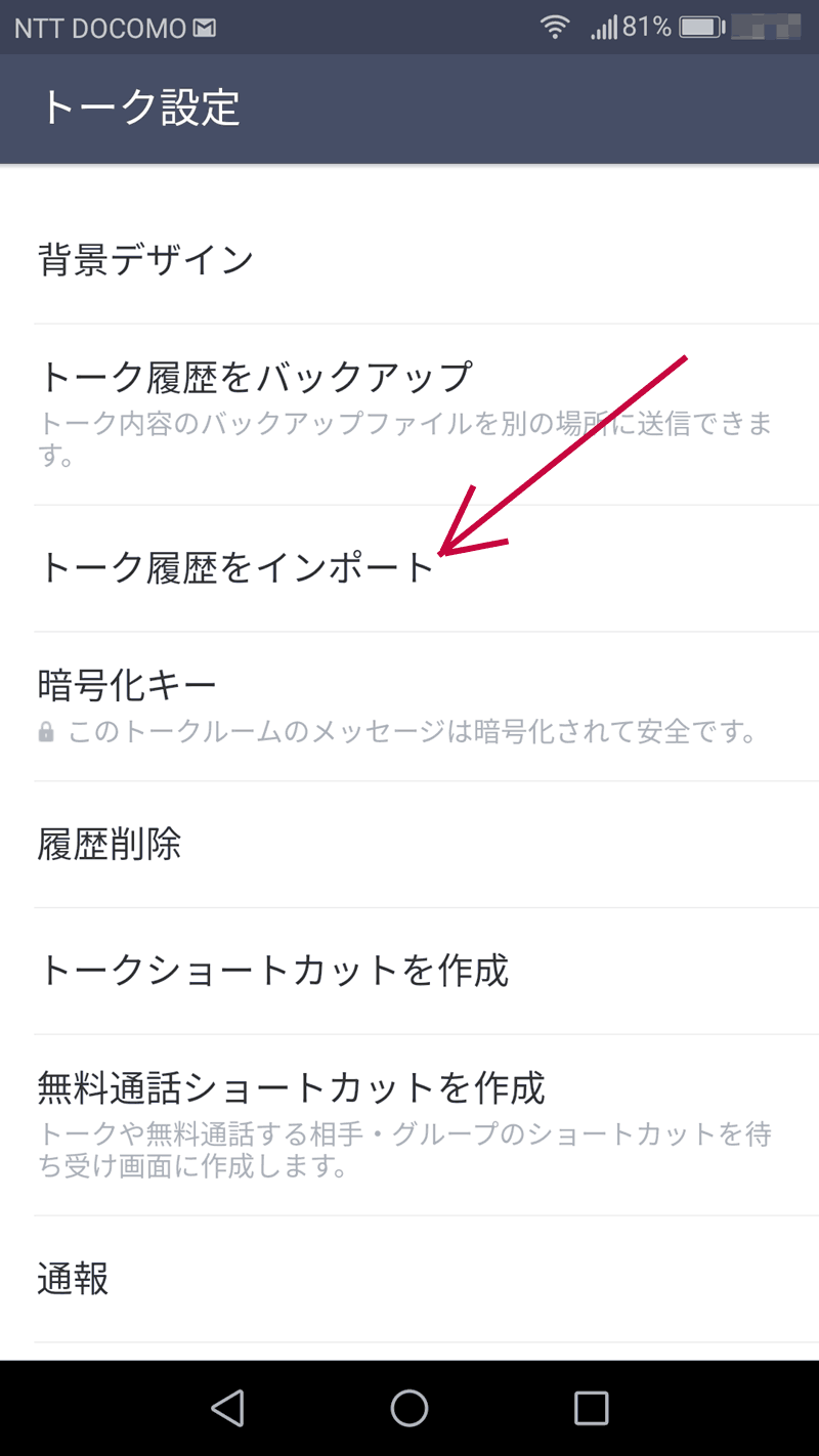 これでLINEに戻り、先程同様にトーク設定を開いてみると、今度は「トーク履歴をインポート」が表示されている。 ではこれを選択する。