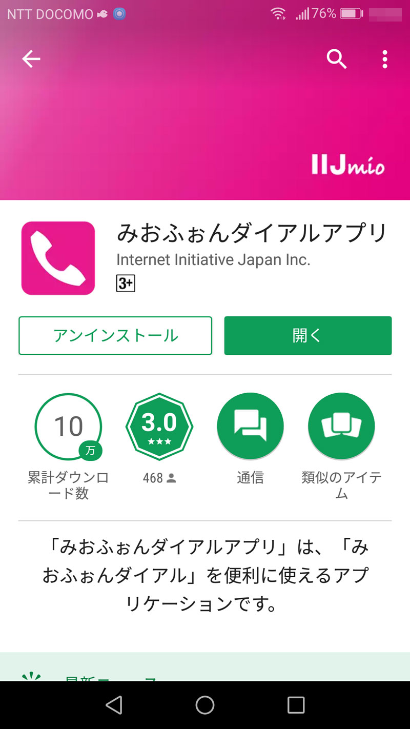 では、その他アプリを入れていこうと思う。 まずはIIJmioに関するアプリ。「みおふぉんダイアルアプリ」これはIIJmioで電話するときは電話の頭に何かを付けてダイアルすると、通常の電話ではなく、みおふぉん電話となり安く通話できる。なので通常の通話アプリを使わずに、このアプリを使って電話をかけると、安い通話を自動でダイアルしてくれてかけてくれる。 通常の通話と変わらず使えるので、これを使いやすいところに置いておけばこちらで電話をかけるので、 自動で安くなる。