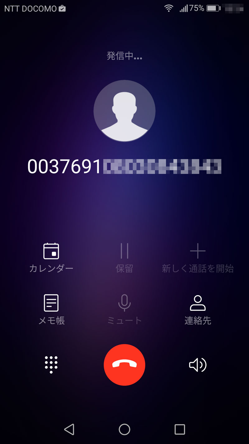 この状態で通常の電話アプリを使って電話をかけてみると、画面には少しメッセージが出てダイアル発信開始。 かけている電話番号は頭に0037691の番号がついた状態でかけていて、しっかりとみおふぉんを使用している。すごい。