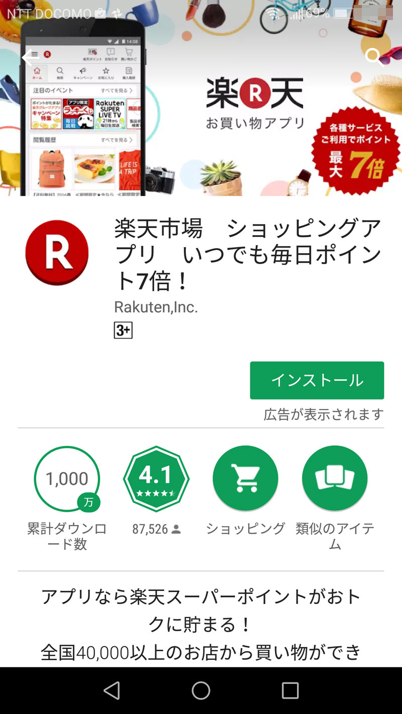 次に楽天アプリ。楽天モバイルの機種であるため、幾つかの楽天モバイルなアプリが入っていたが、 楽天市場のアプリはなかった。入れておけばいいのに。とりあえずポイント倍率を上げるためにインストール。 でもスマホからの注文は画面が見にくいのであまり使用しない。