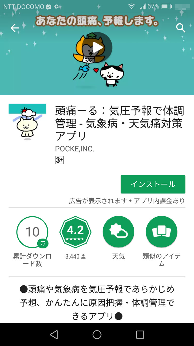 頭痛ーる。頭痛持ちなので、これがあると予測ができて便利。というか頭痛いというときにこれで警告があると、 じゃあ仕方ないと思える。なんとなく安心のために予報をもらっておく。気圧変化は受けやすく案外よく当たる。 逆に頭痛が無いときには見てないので、実はよく外れてるかも。できれば頭痛は来ないに限る。