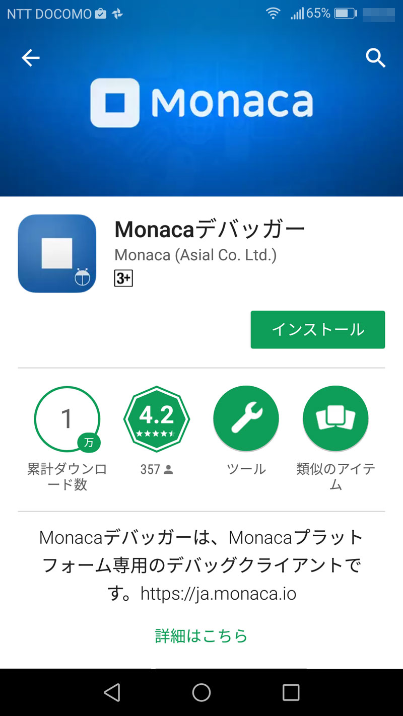 monacaデバッガ。開発ツールのmonacaのAndroid向けデバッガ。これがあると実機でバッグが出来て便利。 でもアプリは作ってない。