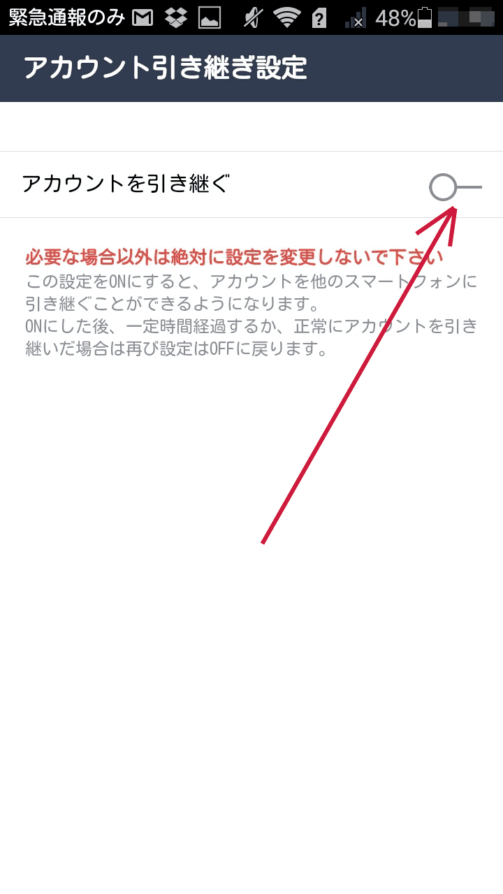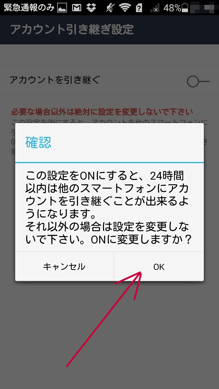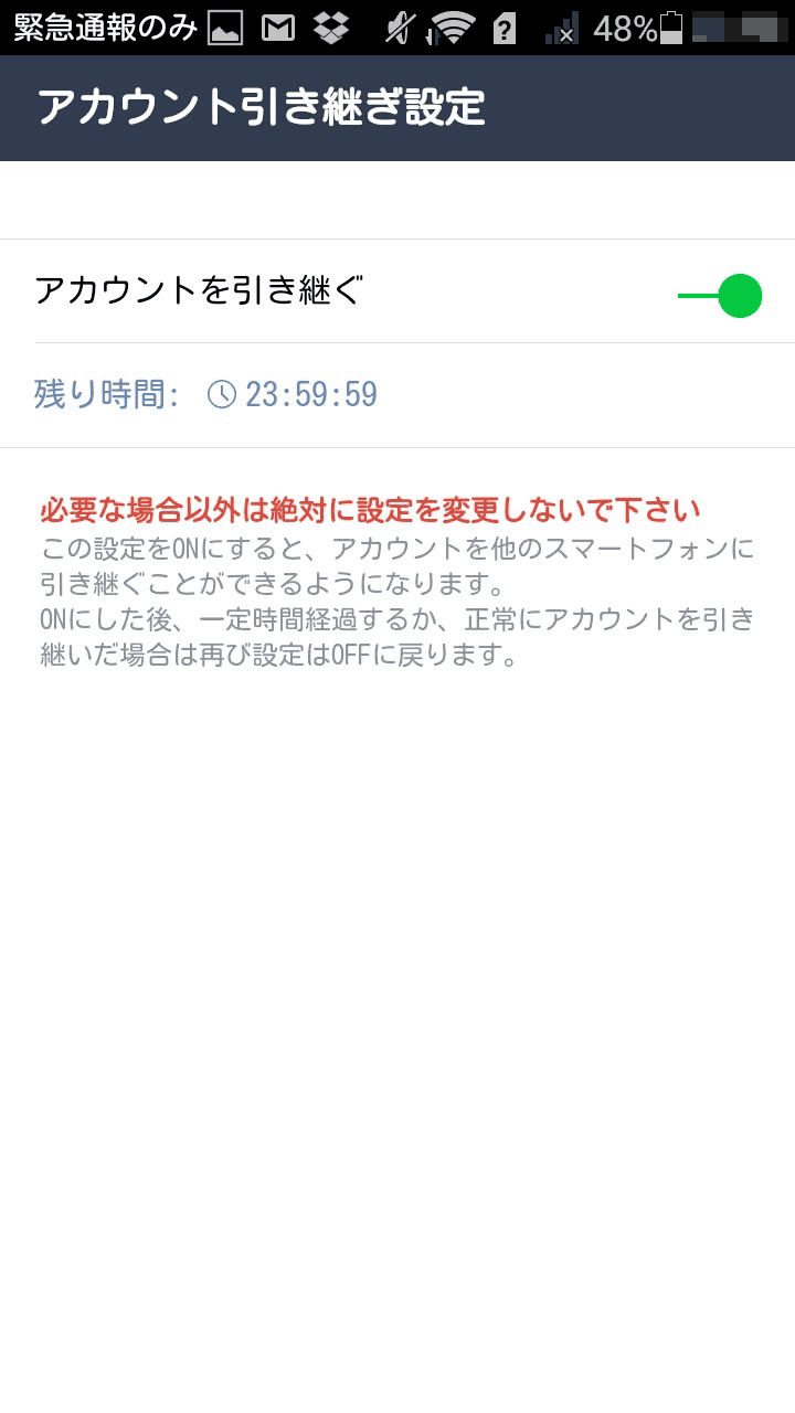 引き継ぎ設定を行うと、カウントダウンが開始される。制限を切られてしまうとちょっとアセるが、 実際には24時間もあり、十分な時間が与えられている。これからすぐに作業するなら特に問題はないのだ。 あと、チェックを元に戻すと、まだ引き返せるのかな?。LINEで危ない橋は渡れないので、 試してみる事はせずに、このまま作業を進めていく。