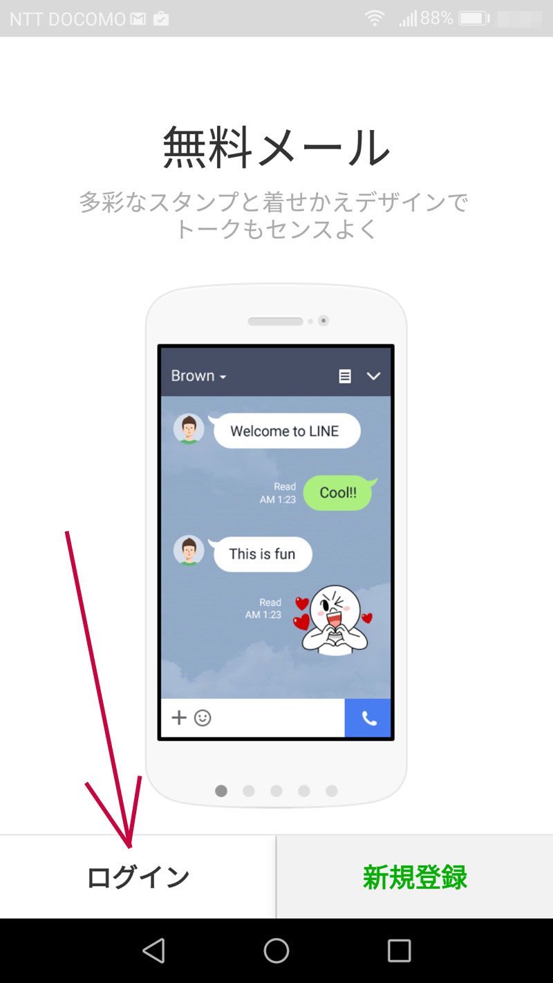 では、新端末側でLINEを起動する。最初の画面では「ログイン」を選択する。 新規としてしまうと新しいアカウントの作成になってしまう。