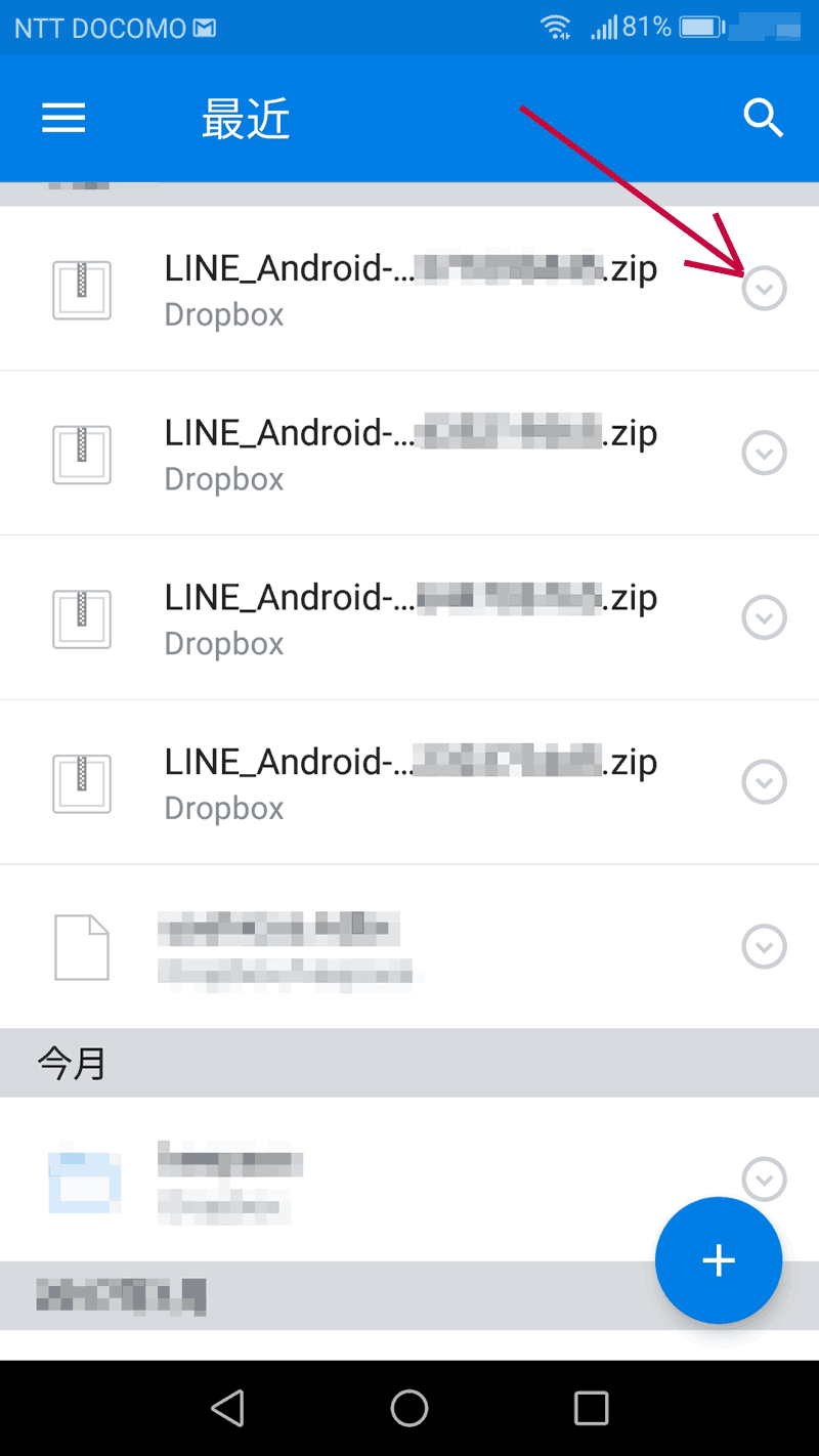 どうやら、line_backupフォルダが有りそこにバックアップファイルがあると、インポートメニューが出てくるようなのだが、 今は何もしていないので、バックアップファイルが存在せず、インポートのメニューが出てこないようだ。 なら、ファイルをそのバックアップフォルダに置けばいいのだ。 トーク履歴のバックアップファイルは、dropboxにあるので、一旦LINEは放置して、dropboxを起動しトーク履歴のバックアップファイルを選択。 そのファイルの右側にある三角を押す。