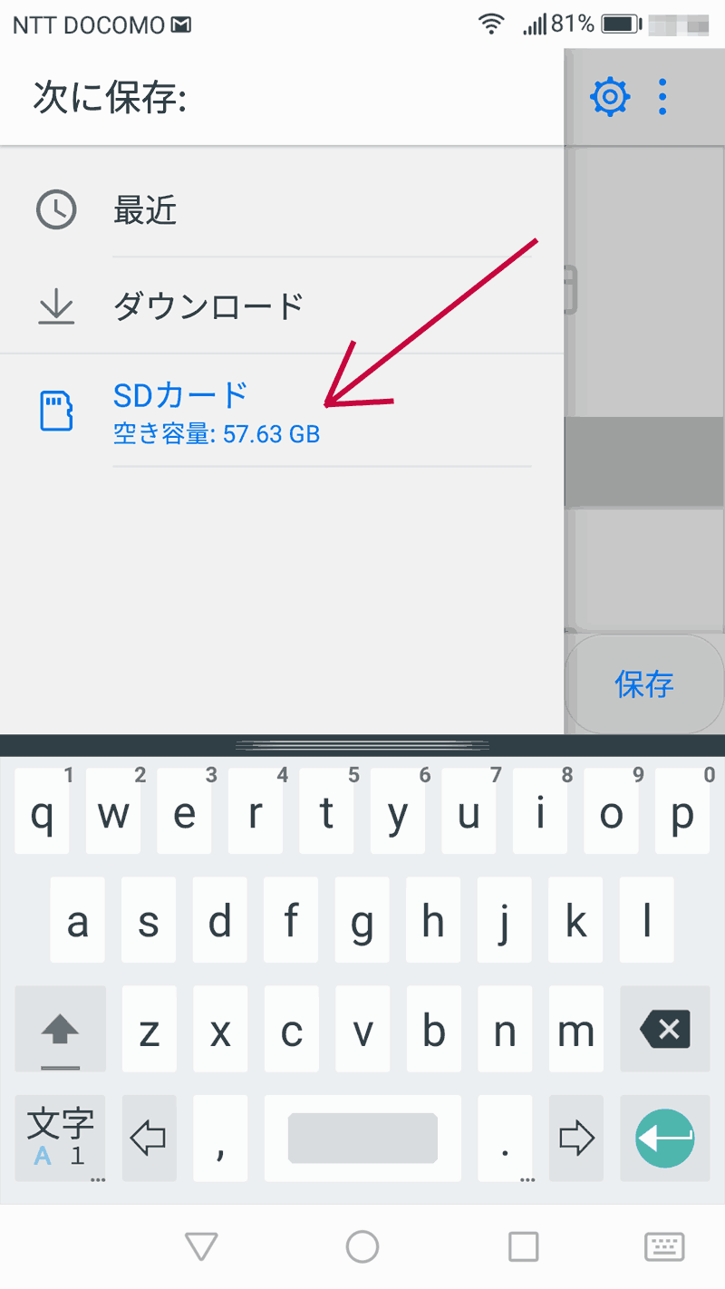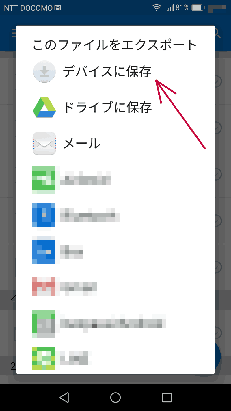 エクスポート先のアプリを選択する画面となるので、「デバイスに保存」を選択する。