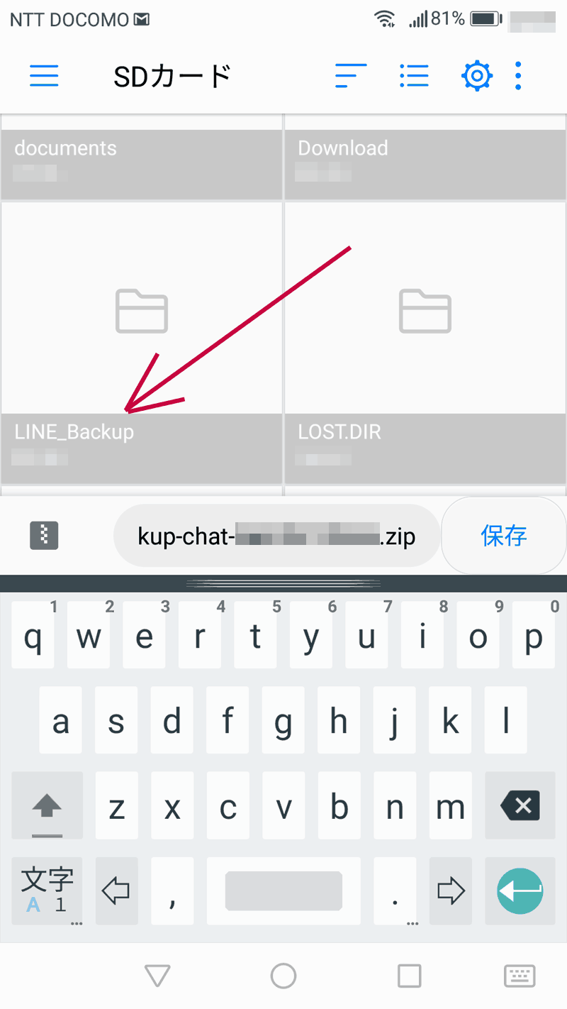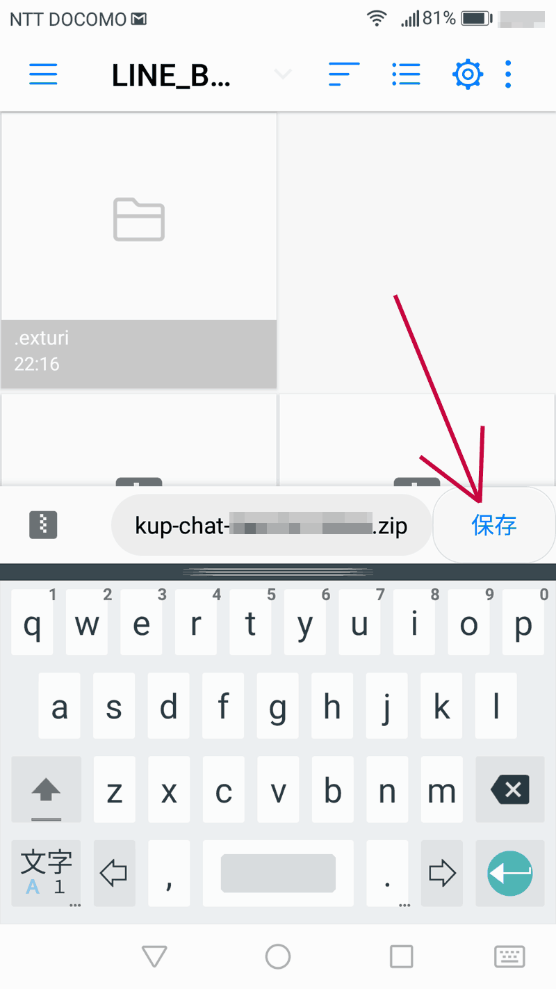ここで右側にある「保存」ボタンを押すと、ここにファイルが展開される。 これでバックアップファイルを新端末に展開することが出来た。 バックアップファイルはトーク相手ごとにあるので、それぞれのファイルを同様に同じLINE_Backupフォルダの中にエクスポートする。