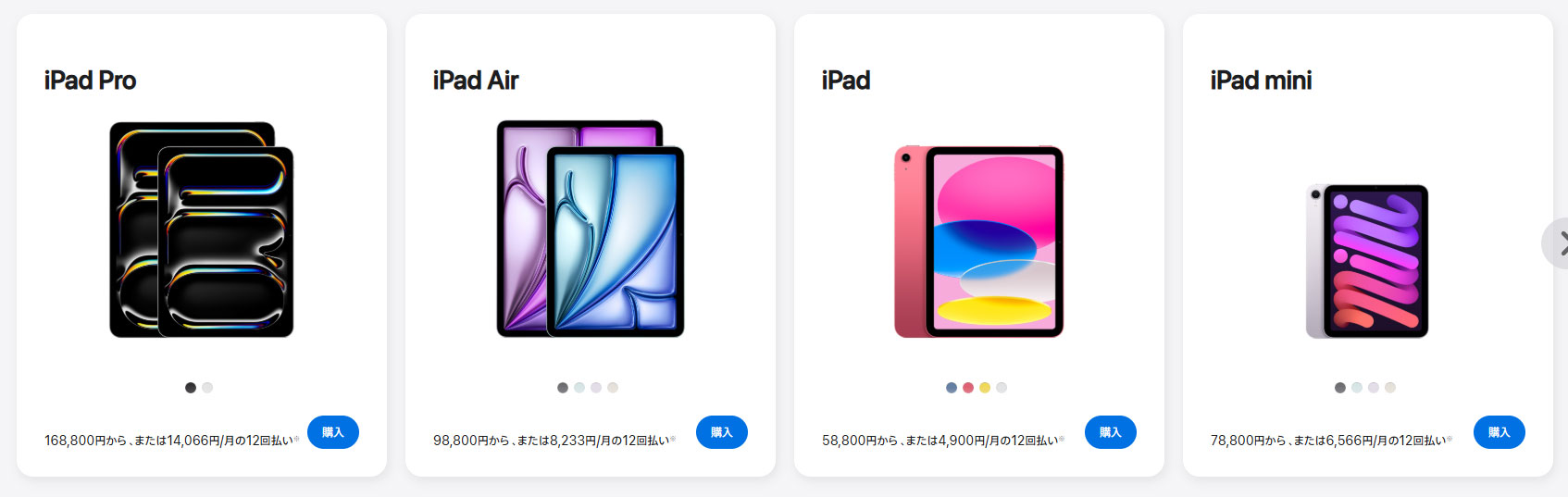 iPadのラインナップを見ると、Pro,Air,miniとノーマルの4種類ある。miniは画面が小さいので除外。それ以外からの選択となるが、Proは最低の11インチ画面でも16万超え。13インチ画面だと20万以上と、手が届かない。