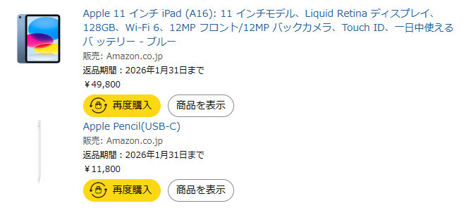 量販店のAppleエリアに行ってみたりして、いろいろ物色していたが、ちょうどAmazonブラックフライデーでiPadのA16が58,800円⇒49,800円と大きく値引きされていた。Apple商品の値引きはめったにないので、チャンスと思い購入。欲しいと思っていた時にちょうど出てきてよかった。