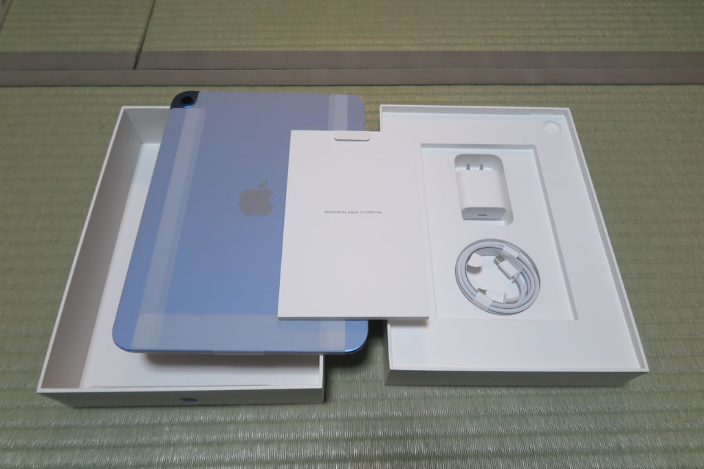 中には、iPadと充電器及び充電ケーブルが入っていた。そういえば今ドキのApple機器はType-Cになってるんだった。Apple系専用充電機器を準備しなくてよくなるのが助かる。LightningやMicroUSBがなくなれば楽になりそう。