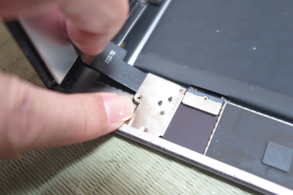 液晶画面側とつながるケーブル御取り外しを行うため、ここのコネクタカバーを外す。ねじが異常に小さいので大変だが3つほど外せばカバーが取れる。金属板の上にある3つのゴミが実は外したネジだ。くしゃみしたら速攻で失くす。