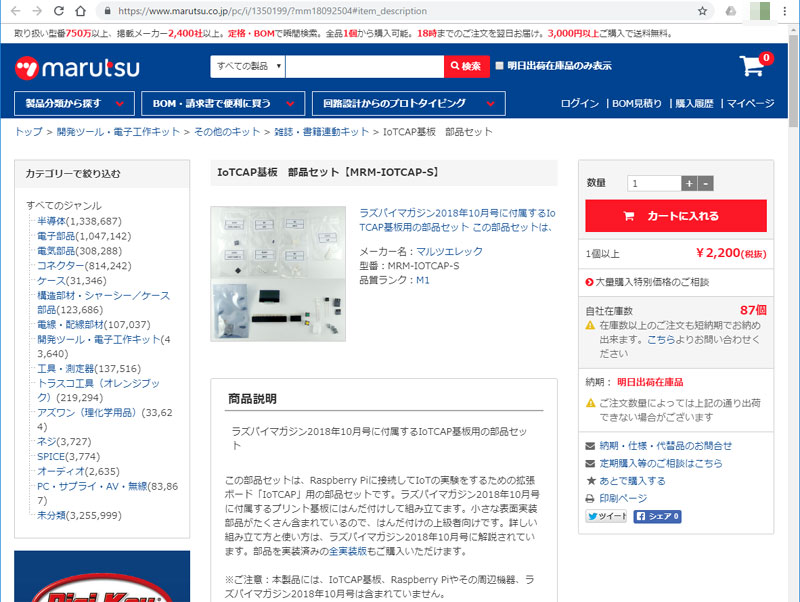ただ、付属しているのは「基盤」のみで、部品は付属していない。そして部品はP52に部品表が書いてあるが、aitendo/マルツ/秋月/廣杉と、いろいろと入手先が分かれており、困難。 しかしマルツを見てみると、 「IoTCAP基板 部品セット」として、 一式販売していたので、購入しみた。