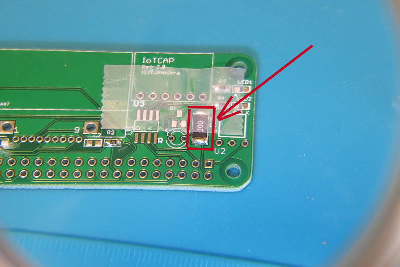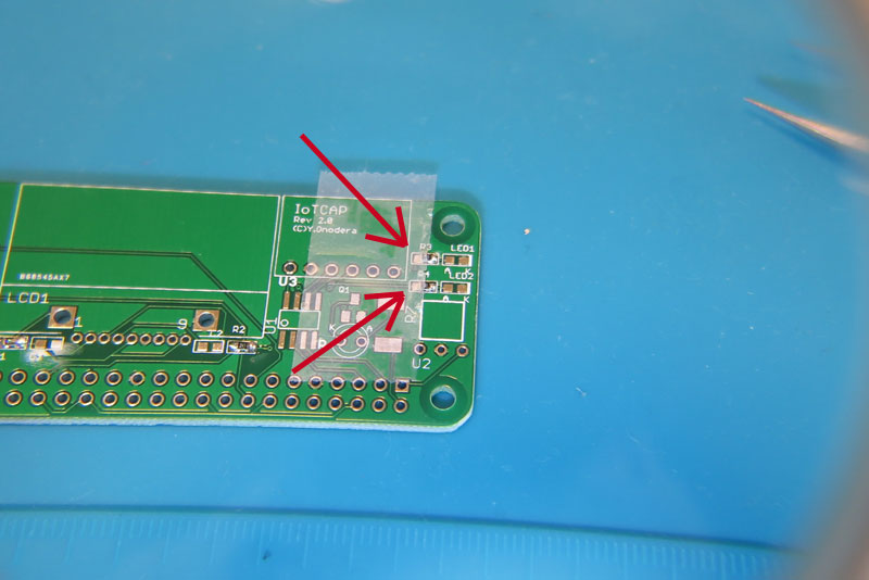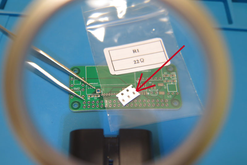 愕然としつつも、やれるところまでチャレンジしてみようと、作成に取り掛かる。 最初はチップ抵抗。1608とかなり小さいサイズで、すべての作業は天眼鏡必須。そしてピンセットを使って調整が必要。 チップ抵抗をよさそうな場所に配置したら、テープで仮止め。この状態ではんだ付けを行う。その右側にあるR2も同様に。