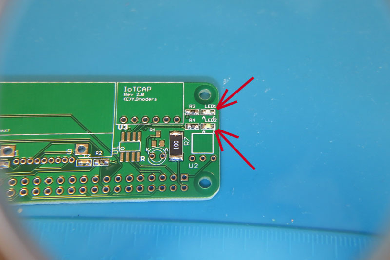 チップLEDを2つ取付完了。上側が青色で、下側が白色のはず。動作させるまで色はわからない。 また、極性が間違っていないかも、動かしてみないとわからない。でも失敗していたら、やり直しは厳しいな。