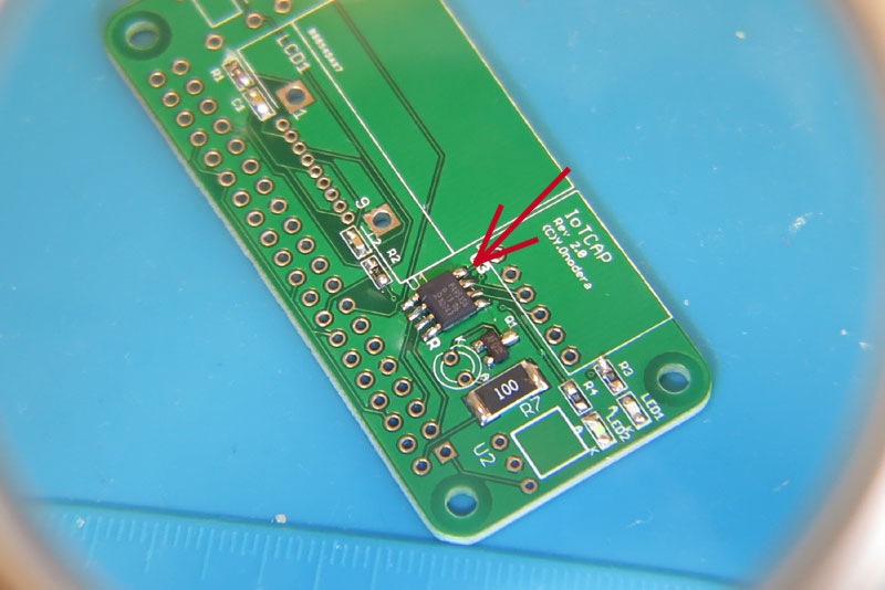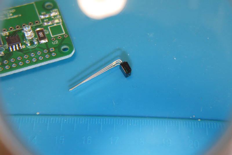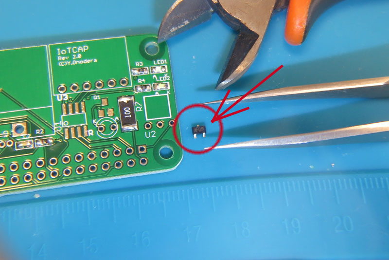 次はLED。LEDには極性があり+側のA(アノード)とマイナス側のK(カソード)を間違えないように取り付ける必要がある。チップLEDの裏側に三角マークが書いてあるので、 それをみて、左右どちらがアノード/カソードなのかをチェックしてから、取り付ける。 下の写真はチップLEDを裏返して、裏に記載の図柄を見ているところ。かなり倍率を上げないと見えない。