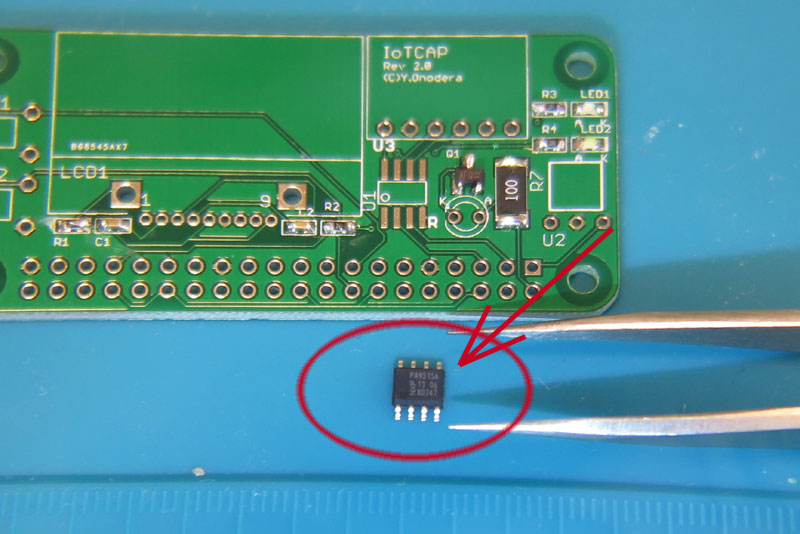 ICチップ表面の丸印を探して1番ピンを特定。それを基板上の丸印と合わせて、方向を決定。 最初はんだ多めに取り付けてブリッジしても気にせず、はんだ吸い取り線で余分なはんだを吸い上げる作戦で何とか取付成功。