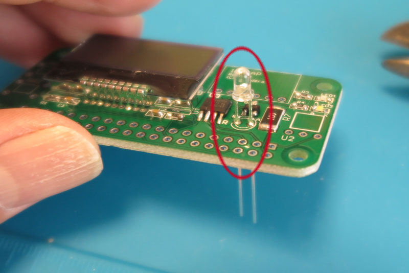 次は赤外線LED。足の長さでアノードとカソードを区別する。切り取るとどっちがどっちかわからなくなり、 通電させて点灯しても赤外線なので見えないのでチェックもできない。あらかじめきちんと確認して、穴に差し込んでおく。