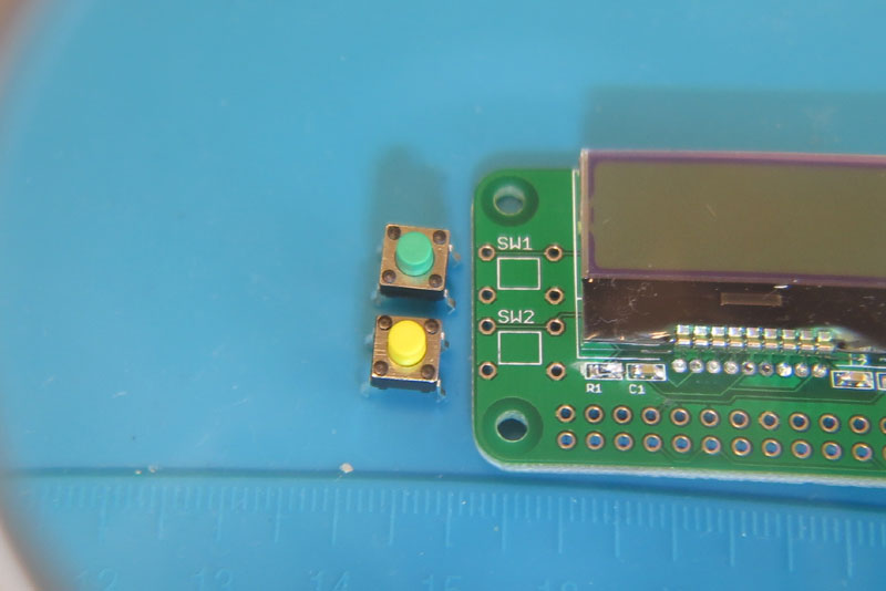 次にスイッチを2つ付ける。これらはそれなりの大きさなので、そんなに難しくは無い。 穴位置で縦横がわかるので、きちんと刺さる方向に差し込んではんだ付けする。