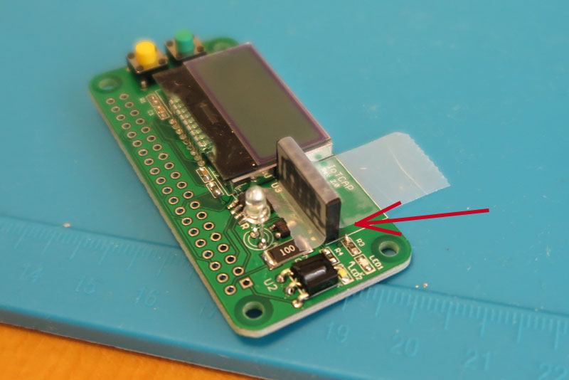 次にBME280を取り付けるピンコネクタを取り付ける。BME280は温度測定を行うが、 基板に近いとラズパイやほかの機器の温度に影響されやすくなるので、少し離すためにコネクタをつけるようだ。 垂直になるようにテープでまずは固定して、簡単にはんだ付けして最終調整してから、本付けする。 斜めになるとかっこ悪いので、ちゃんとまっすぐ取り付けよう。