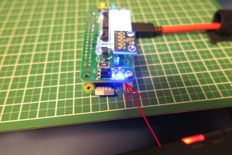 次はLED。2つ接続されており、上段(写真右)にある青のLEDがGPIO5に接続されているとのこと。 点灯させてみる。gpioコマンドで行うようだ。