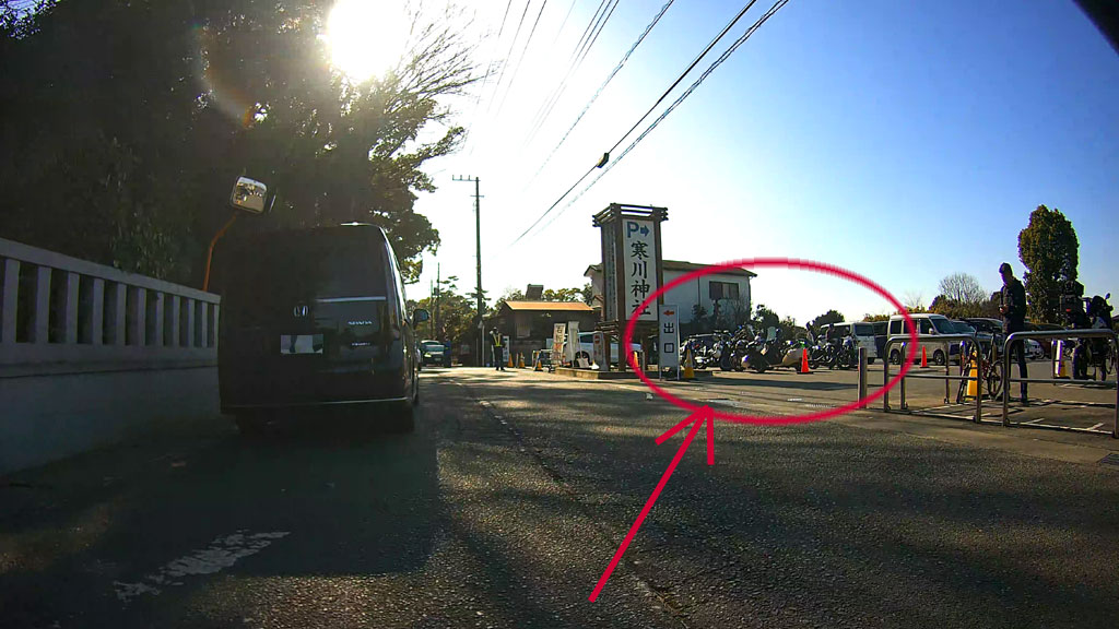 別ルートだと駐車場が右折入庫になるが、右折不可のためUターンが必要なルートとなる。まあバイクなので何とかなるだろうと向かう。途中までは何とか移動できたが神社近辺ではやはりかなり渋滞している。反対車線は駐車場待ちで止まっているような状態だった。結果として対向車線がほぼ車が来ないので、駐車場には右折でシレッと入った。バイク用の駐車エリアが用意されていて、大型バイクも何台か駐車されていた。そこに駐車して完了。