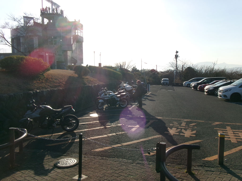 場所としては高麗山公園(こまやまこうえん)というところらしく、高麗山の頂上あたりにある。山をどんどんと登っていくと、駐車場があった。もう少し上まで道が続いていたので、さらに登ってみると、頂上側にも小さめの駐車場があり、駐輪場もあってバイクが数台停めてあるので、そこにバイクを駐車した。