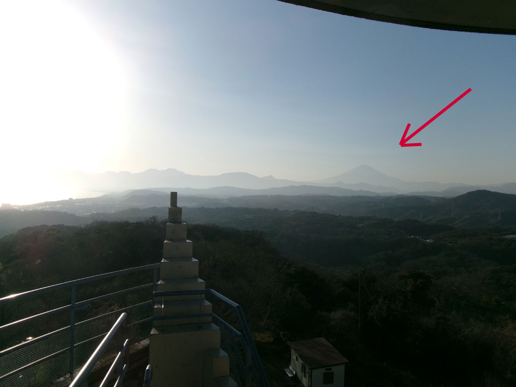 南は海が近く大きな海が見える。西側を見ると富士山が見えた。今日は午後から風が出て空気が澄んでいないが、ぼんやりと輪郭は見える。午前中だときれいに見えるかも。