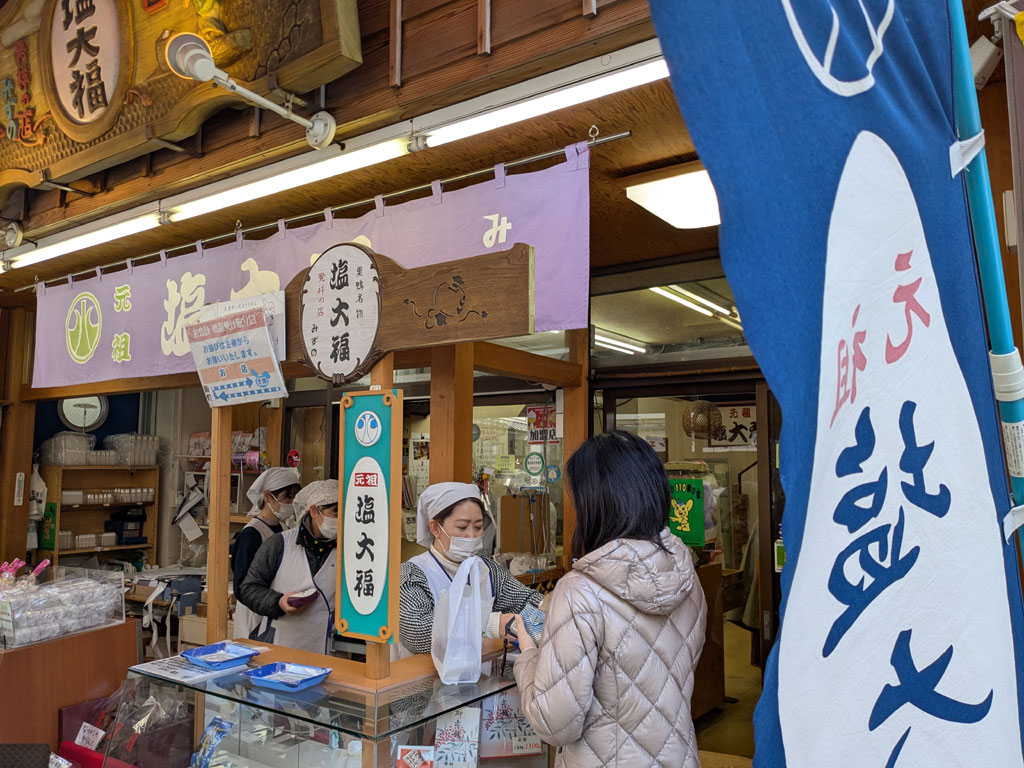 商店街を歩く。かなり人が多い。そして店もたくさんあっていろいろと面白そう。行列があったので覗いてみると、塩大福の「みずの」だった。おなかすいているしせっかくなのでと列に並んで購入。塩大福にまめ大福にみたらし団子を買った。あとで食べよう。