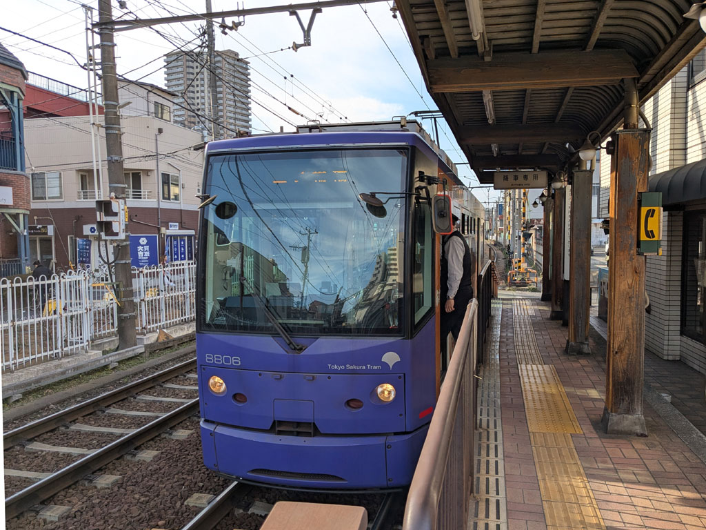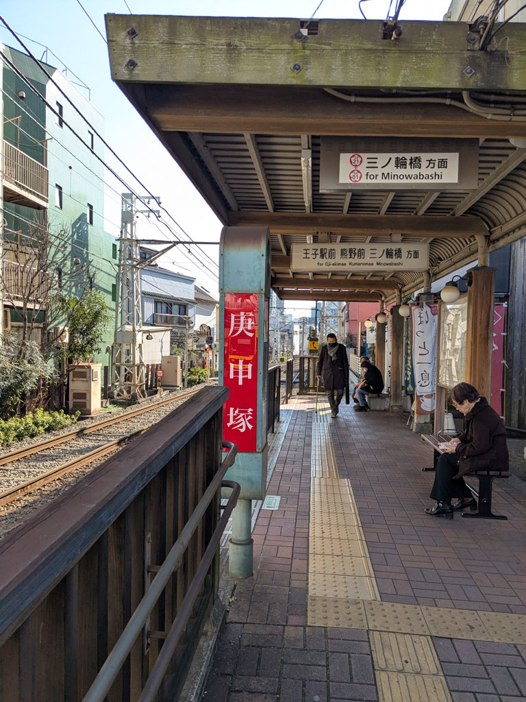 巣鴨から商店街を抜けて都電荒川線(今はさくらトラムというらしい)庚申塚駅まで来た。ここから路面電車に乗ってみる。切符の券売機や改札はなく、歩いてホームまで行く。バス同様に乗車時にICカードをピッとするだけだ。