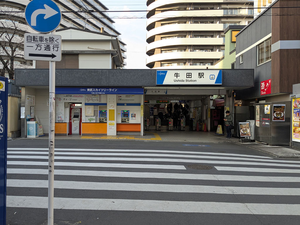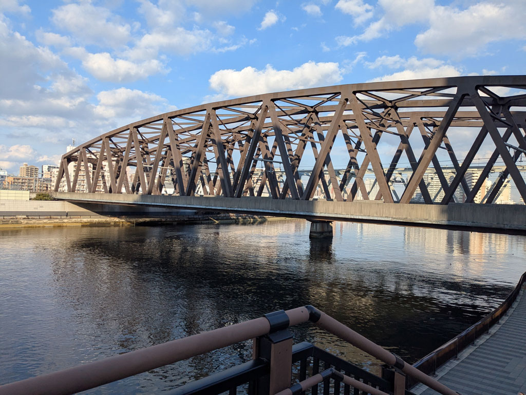 千住大橋から千住汐入大橋まで川辺を歩き、京成関屋駅を抜けて、東武牛田駅へ。