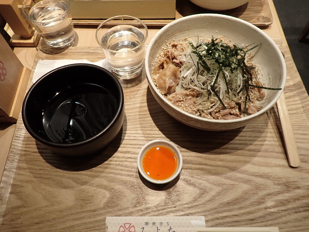 そこそこ人が並んでいたけど、おそばなら回転早いだろうから、列に並んで順番を待つ。チャッピーにおすすめを聞いてみると、辛味肉つけそばが人気だと教えてくれたので、食べてみようと思う。列に並んでいる間に注文が来たので、予定通り辛味肉つけそばを注文。しばらく列に並んで席に案内されたら、すぐにそばがやってきた。